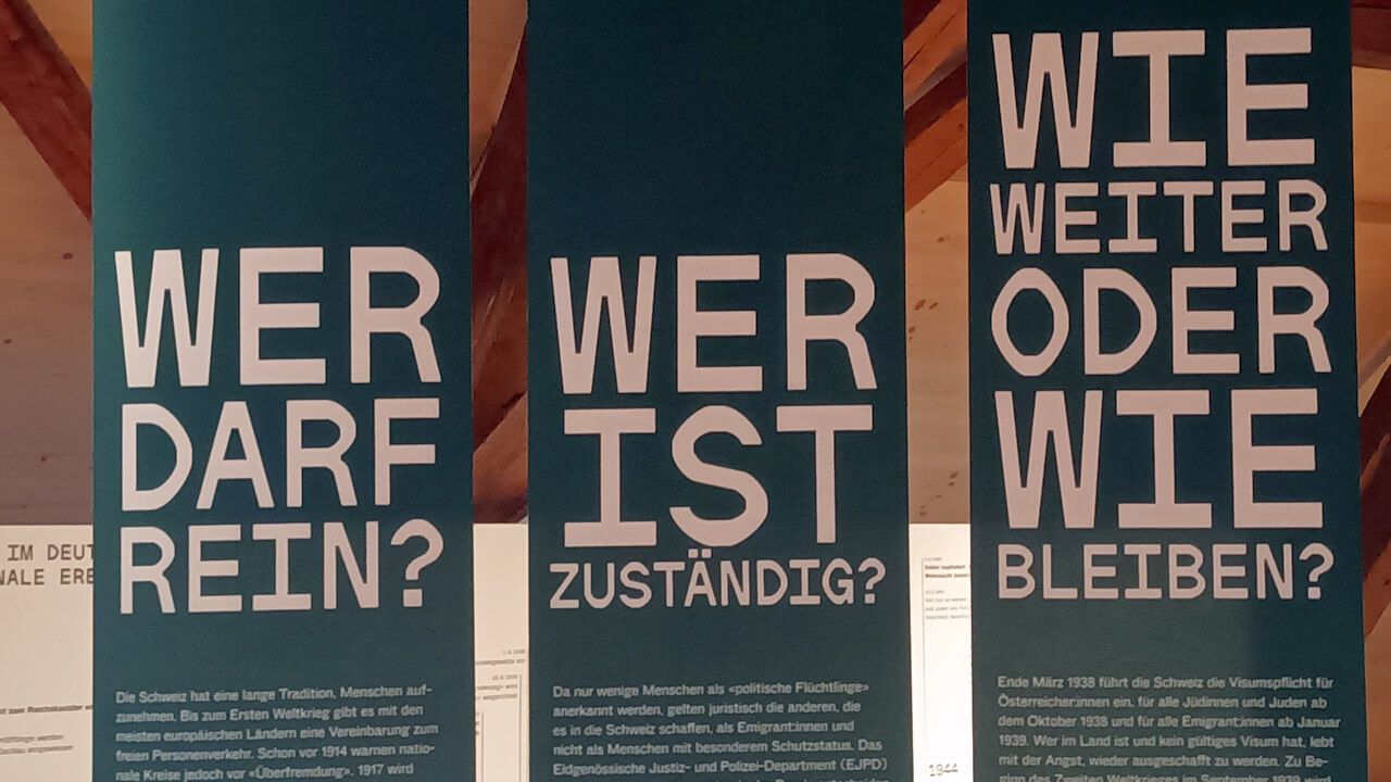 Eine Etage höher versammelt „Flucht“ neben Schautafeln zum Geschehen rund um die Schweizer Landesgrenzen vor allem Interviews und andere Tondokumente von Geflüchteten und Fluchthelfer:innen. Erstaunlich der Bericht des aus Wien geflohenen jüdischen Schlagerkomponisten Willy Geber, den die SS noch im August 1938 mit anderen Emigranten an die Grenze zur rettenden Schweiz geleitete. Bald sollte diese Grenze geschlossen werden und im Machtbereich der Nazis die systematische Vernichtung des europäischen Judentums beginnen.