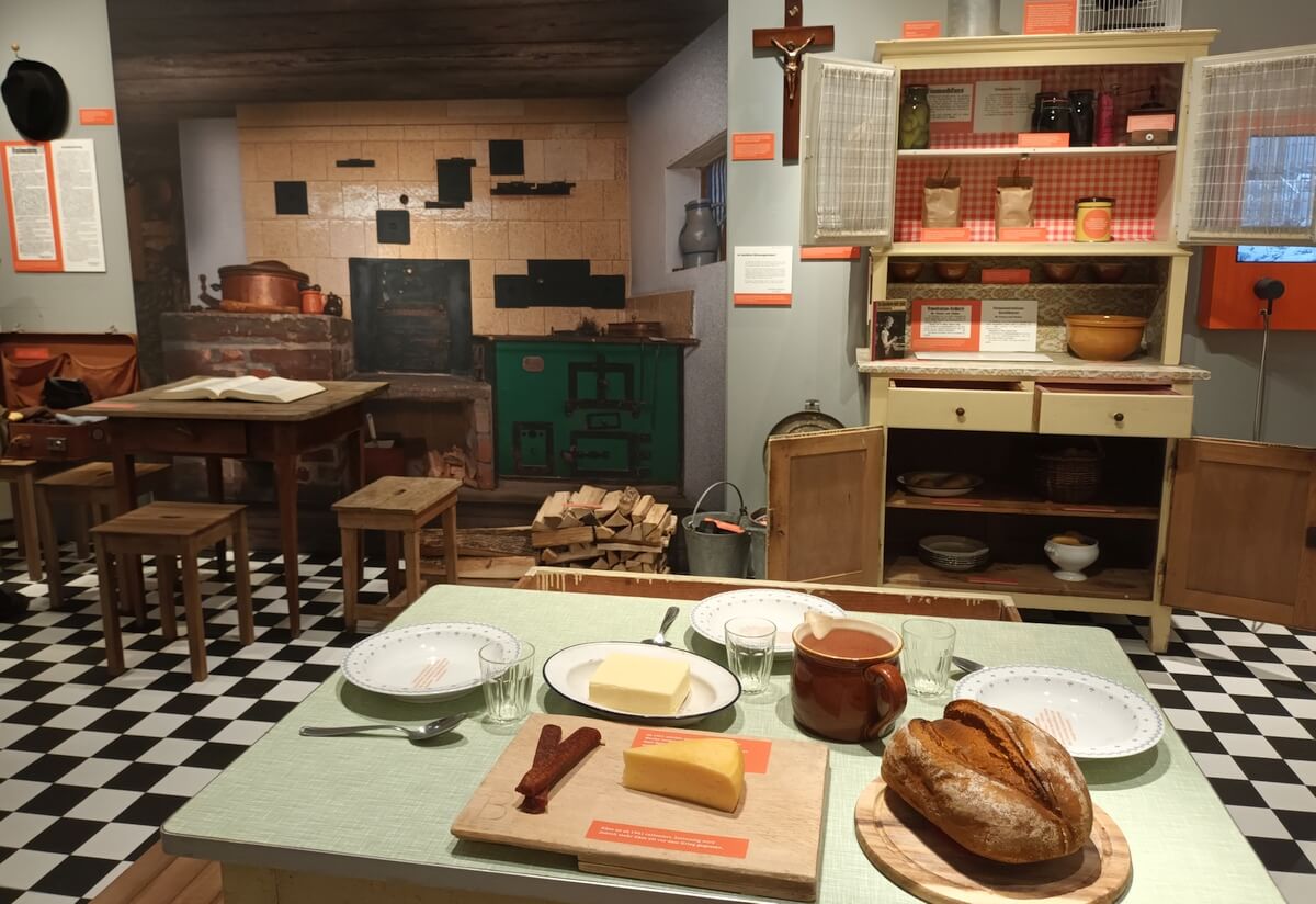 Die Ausstellung im Altstättener Museum Prestegg (fragen Sie an der Bar nach der Story zu Him-Bär!) teilt sich in die Themen Alltag und Flucht. Man lebte hier auf der Schweizer Seite zwar kriegsverschont, doch im Schatten des Krieges. Womit die Fenster verdunkeln? Wohin flüchten bei einem Einmarsch? Fotografien und historische Dokumente geben Einblicke in den Alltag der Rheintaler und Rheintalerinnen. Die handschriftlich notierte Dorfchronik der Rheintal-Gemeinde Berneck lässt uns den Alltag mit auf Nahrungsmittelautonomie zielender „Anbauschlacht“ und der kriegsbedingt verschobenen Umstellung der Rheintalbahn-Tram auf Omnibusbetrieb nacherleben.