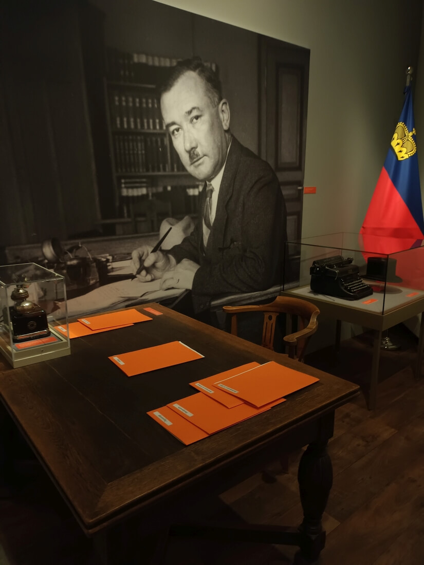 Am Schreibtisch von Josef Hoop, Regierungschef von 1928–45, können Besucher:innen der Ausstellung sich in Dossiers mit Akten befassen, die Hoop damals bearbeitete. Aufschlussreich ist das Dossier zum Thema Flüchtlinge. Von 1919 bis in die 50er Jahre ermöglichte Liechtenstein sogenannte Finanzeinbürgerungen, nämlich den Kauf des Bürgerrechts gegen eine extrem hohe Gebühr, die maßgeblich zu den Staats- und Kommunaleinnahmen beitrug. In der NS-Zeit erwarben so 240 Menschen die Staatsbürgerschaft, darunter 140 Juden und Jüdinnen. Die meisten der Eingebürgerten lebten gar nicht im Land, konnten mit einem Liechtensteiner Pass aber anderswo leichter Schutz finden als als Deutsche oder Staatenlose.